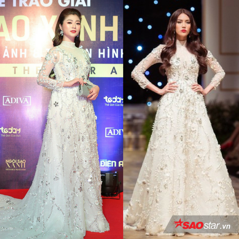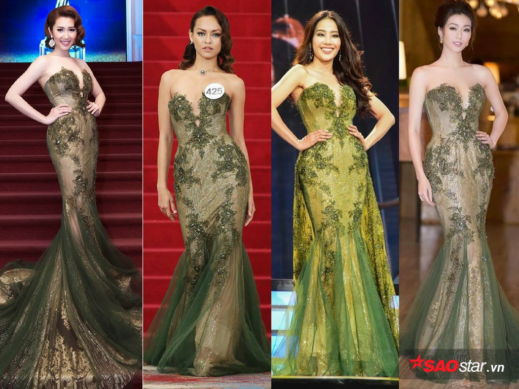 4. Chiếc đầm đuôi cá màu xanh rêu. Thúy Ngân mặc chiếc đầm này tại lễ trao giải Ngôi sao xanh tối ngày 11/1. Trước đó, trong thử thách catwalk tại cuộc thi Hoa hậu Hoàn vũ, Mai Ngô lựa chọn thiết kế này để trình diễn. Nam Em cũng đã từng lựa chọn chiếc đầm này để trình diễn trong đêm chung kết Hoa hậu Trái đất 2016. Chân dài Khánh My cũng đã từng mặc thiết kế được ưa chuộng này tại một sự kiện.