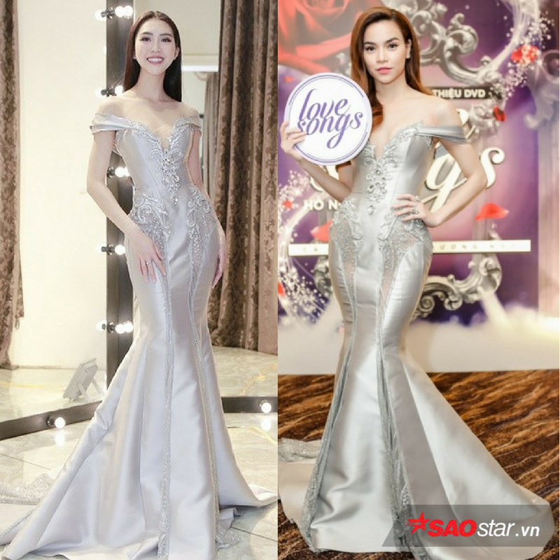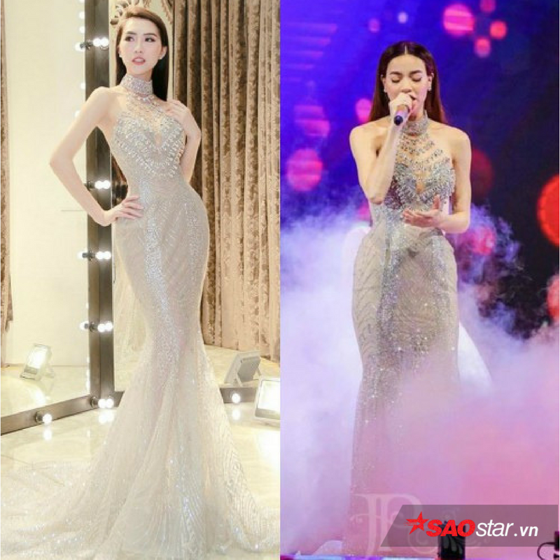 9. Chiếc đầm đuôi cá màu bạc. Cũng tại buổi thử đồ này, Tường Linh lại tiếp tục chọn lại thiết kế lộng lẫy từng được Hà Hồ chọn mặc tại một sự kiện trước đó khá lâu. Nếu Hà Hồ chọn kiểu tóc nâu vàng uốn xoăn thì Tường Linh nhẹ nhàng hơn với kiểu tóc đen xõa thẳng.