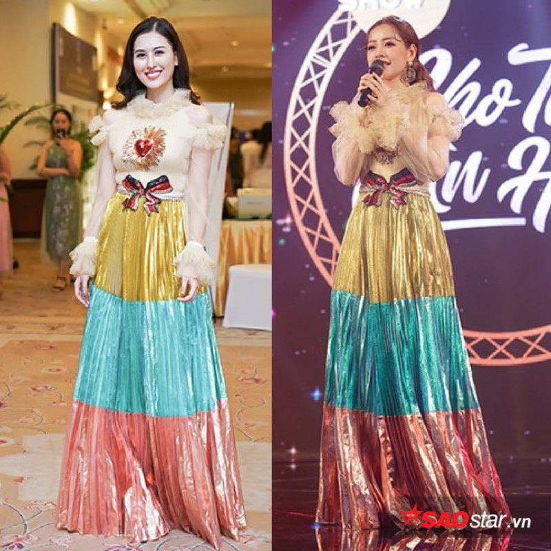 11. Chiếc đầm nhiều tầng 3 màu sặc sỡ. Hà Lade và Chi Pu cũng từng “mặc chung” chiếc đầm này. Trước khi Hà Lade mặc tại một sự kiện vào chiều 9/1, Chi Pu đã diện nó tại một buổi họp báo ra mắt sản phẩm âm nhạc của mình hồi cuối tháng 10 năm ngoái. Tuy Hà Lade có phần nhỉnh hơn Chi Pu về chiều cao khiến chiếc váy trông đỡ phần luộm thuộm. Nhưng xét về tổng thể, từ cách trang điểm đến mái tóc cột cao nhuộm nâu của Chi Pu tạo sự trẻ trung hơn so với cách trang điểm “đứng tuổi” của Hà Lade.