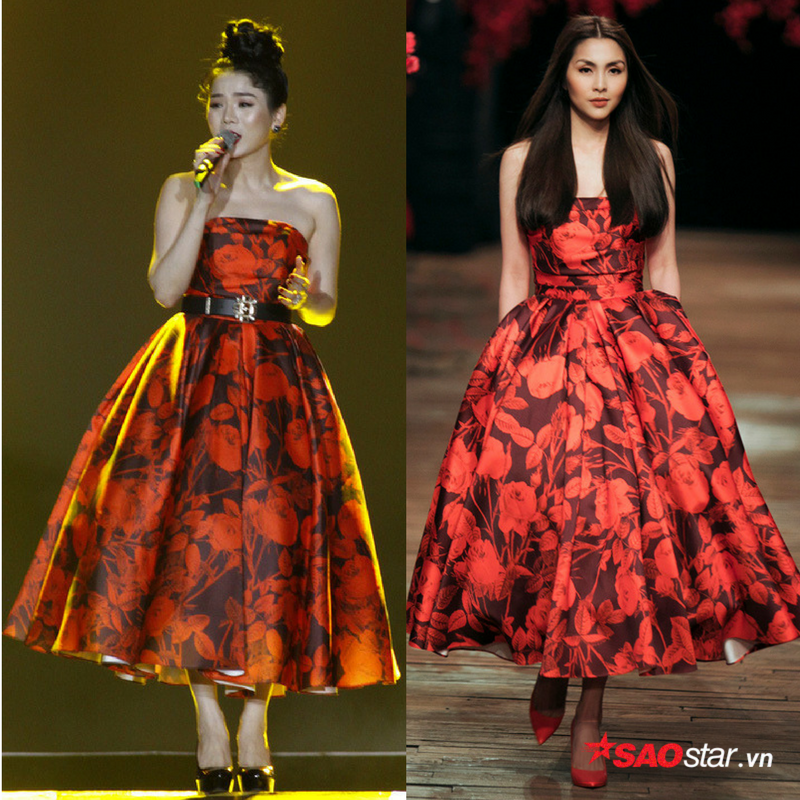 1. Chiếc đầm màu đỏ cúp ngực, xòe bồng. Tại lễ trao giải Làn sóng xanh vào tối 13/1, Lệ Quyên đã mặc thiết kế này. So với “bản gốc” mà Hà Tăng trình diễn hồi cuối năm 2017, Lệ Quyên có chút thay đổi khi phối cùng phụ kiện thắt lưng tạo điểm nhấn. Ngoài ra, ca sĩ chọn kiểu tóc búi cao trên đỉnh đầu giúp cô khoe triệt để bờ vai trần cùng chiếc cổ thanh thoát.