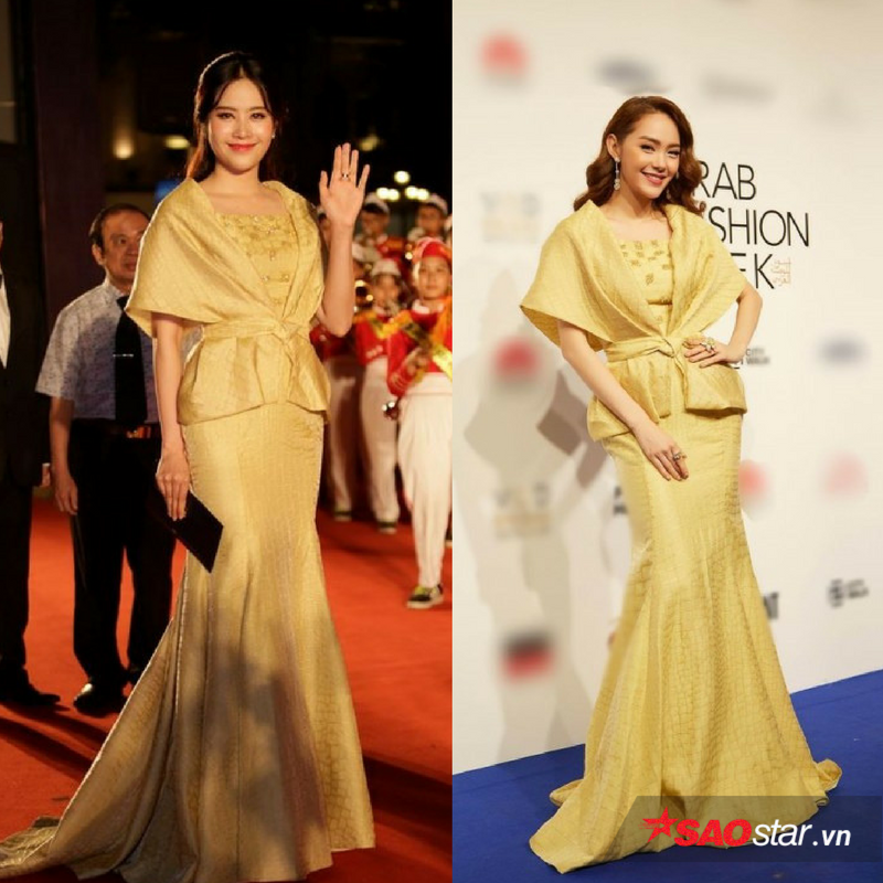2. Chiếc đầm màu vàng phong cách hoàng gia. Xuất hiện trong lễ trao giải Ngôi Sao Xanh vào ngày 11/1, Nam Em đã mặc lại thiết kế mà Minh Hằng từng diện tại khuôn khổ tuần lễ thời trang Arab Fashion Week vào cuối năm 2017. Nếu Nam Em tiết chế phụ kiện nhất có thể thì Minh Hằng “mạnh tay” đầu tư bộ trang sức kim cương trị giá gần 20 tỷ đồng tăng phần sang trọng cho bộ cánh.