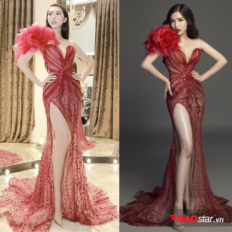 8. Chiếc đầm xuyên thấu màu đỏ chít eo. Chiều ngày 10/1, đến một showroom thời trang để lựa chọn xiêm y lộng lẫy cho cuộc chinh phục ngôi vị cao nhất tại Hoa hậu Hoàn cầu 2017, chiếc váy mà người đẹp Phú Yên chọn thử lại đúng thiết kế mà Hoa hậu Khánh Phương đã mặc chụp ảnh trước đó.