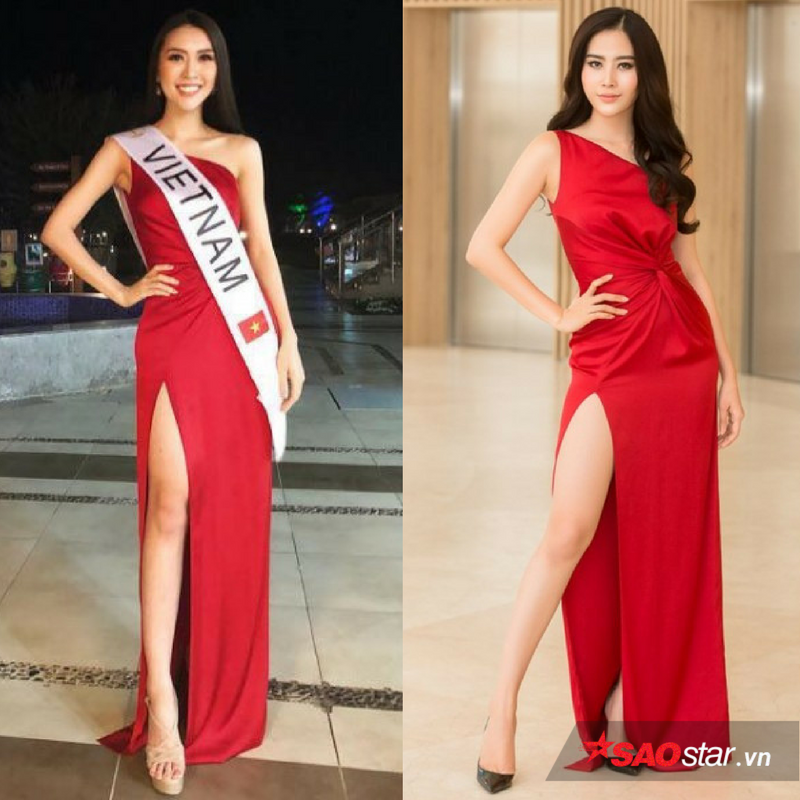 6. Chiếc đầm đỏ rực lệch vai xẻ cao. Tường Linh mặc thiết kế này trong một sự kiện mở màn chào đón thí sinh tại Hoa hậu Liên lục địa 2017 đang diễn ra ở Ai Cập. Còn hoa khôi Nam Em đã mặc thiết kế này đi sự kiện thảm đỏ vào năm trước. Có thể thấy trong thiết kế này cả hai người đẹp đều vô cùng lộng lẫy.
