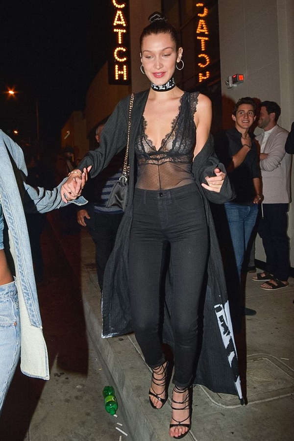 Bella Hadid mix đồ nền nã khi mặc một dạng áo lót ren BRALETTE mix cùng quần jeans đen và choàng áo cardigan dáng dài ở ngoài cùng phụ kiện dây chuyền đeo cổ cùng giày cao gót sọc dây