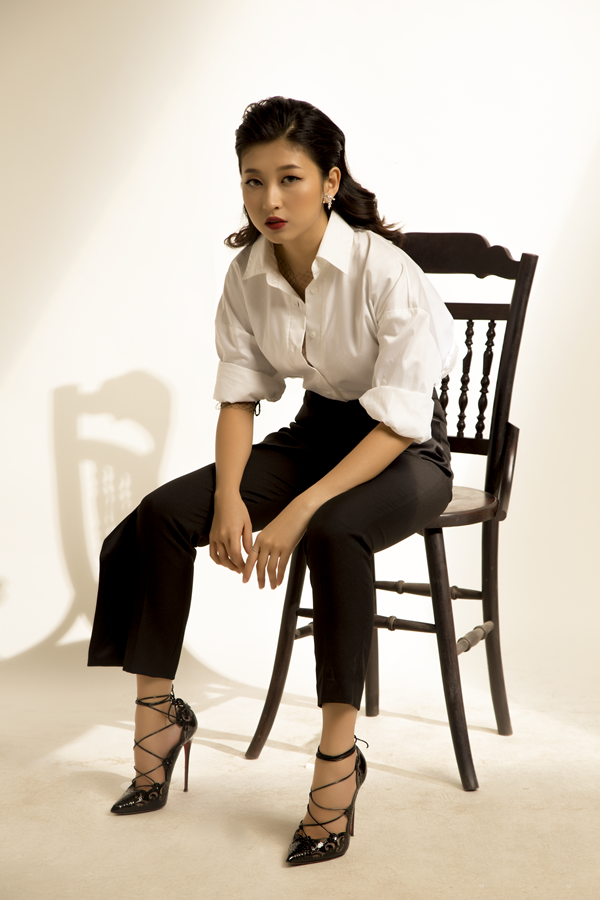 Diện áo sơ mi trắng quần tây, Kim Chi pose dáng khá ngầu trước ống hình nhiếp ảnh gia.