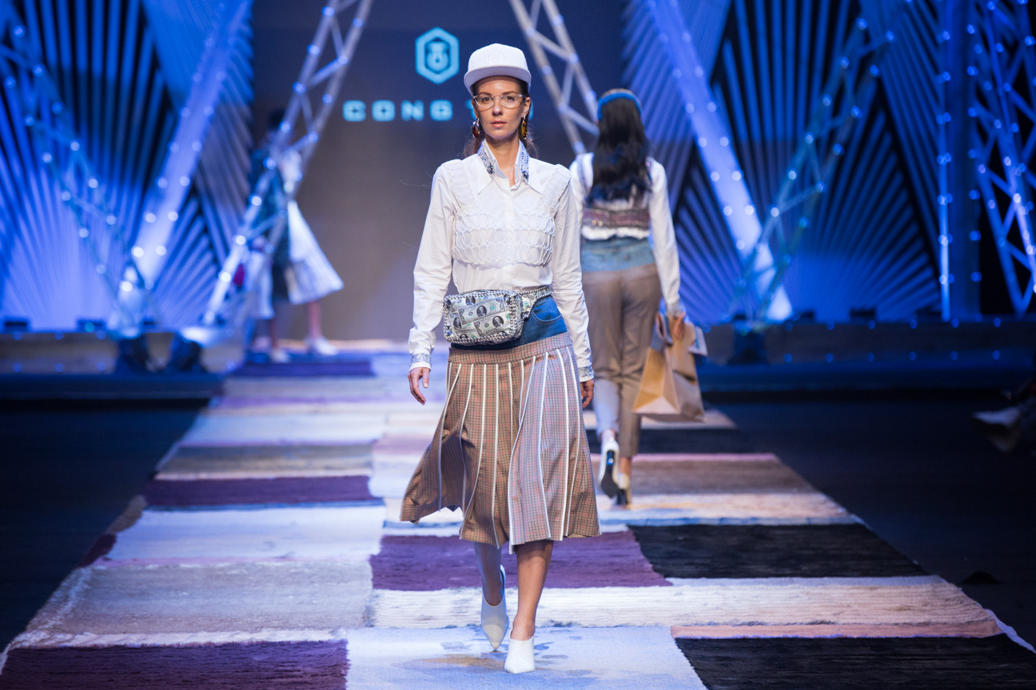 Trình diễn một sáng tạo khác của NTK Công Trí, Kim Dung diện trang phục ánh kim với những đường tua rua lấp lánh được phối cùng boots cao cổ tạo hiệu ứng tôn lên vóc dáng chuẩn mẫu của mình. Chiếc áo khoác cách điệu trong thiết kế vừa phá cách, vừa năng động. Bộ cánh kết hợp cùng snapback trẻ trung khiến cho trang phục concept công sở trở nên độc đáo và ấn tượng hơn bao giờ hết.