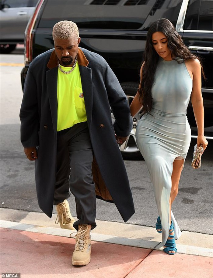 Kim Kardashian xuất hiện cùng chồng tại Miami vừa qua trong chiếc váy màu xanh dương ombre ôm sát đường cong triệt để, gần đây cô Kim tiết lộ rằng chồng mình Kanye West đã trở thành stylist cho mình.