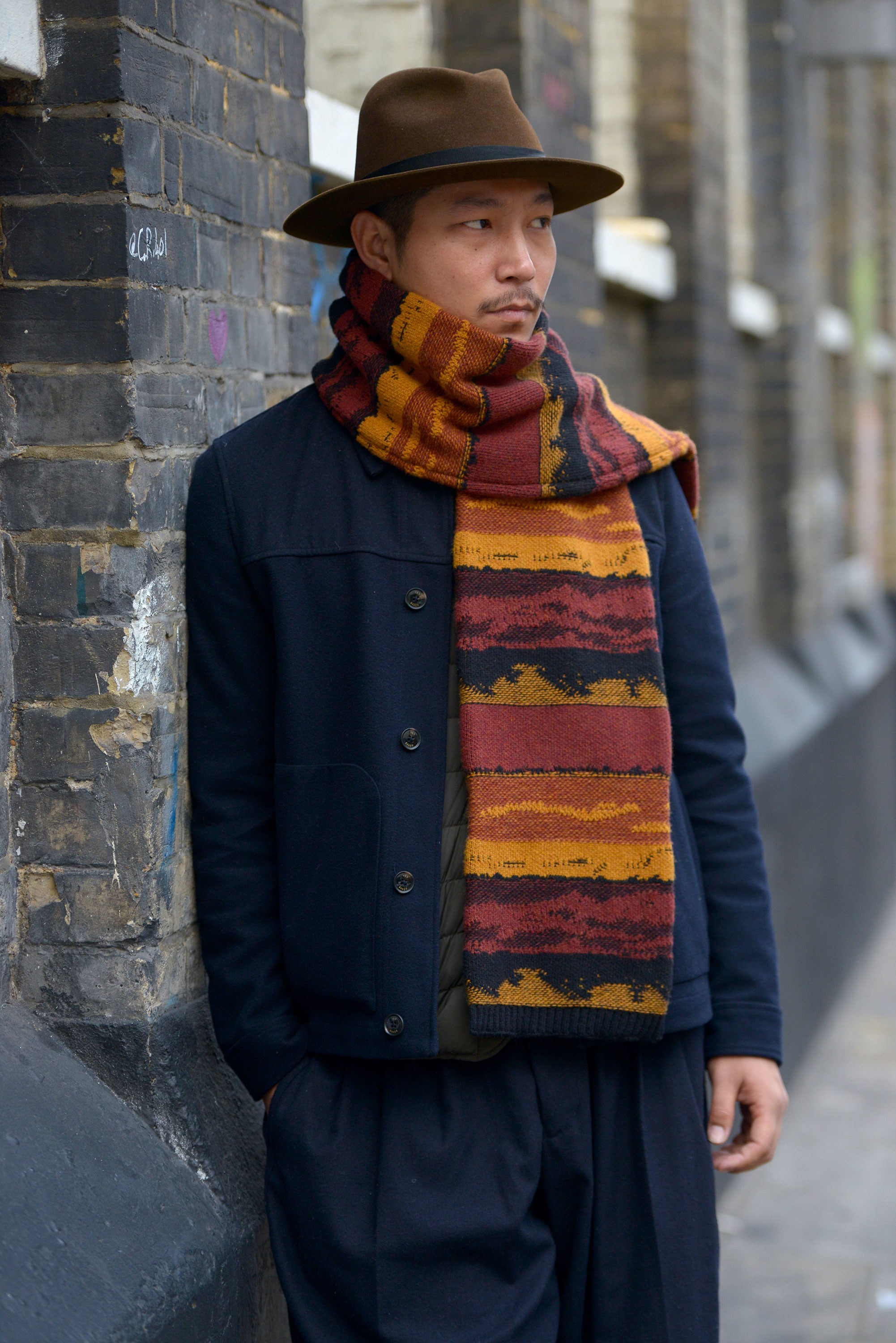 Áo khoác dáng dài màu đỏ cùng với kỹ thuật len móc ấn tượng. Trang phục giúp anh này nổi bật trên đường phố