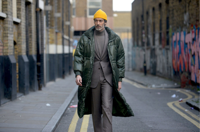 Khéo léo trong cách phối đồ của người đàn ông trung niên khi diện bộ suit bên trong kết hợp với áo phao bên ngoài cùng phụ kiện mũ beanie màu vàng
