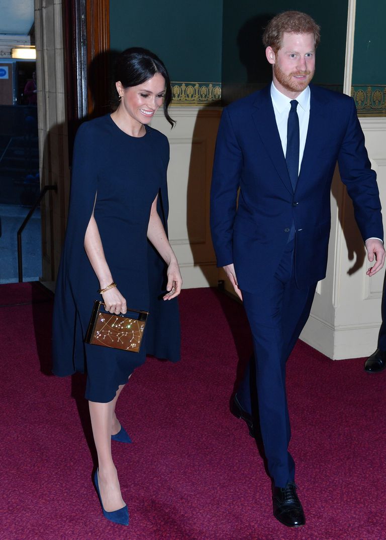 Trong tiệc sinh nhật nữ hoàng Anh, công nương tương lai Meghan Markle rạng rỡ sánh bước cùng hoàng tử Harry trong chiếc váy cape thanh lịch. Người đẹp kết hợp trang phục hiệu Stella McCartney với giày cao gót màu sắc đồng điệu và phụ kiện clutch hình hộp nổi bật.