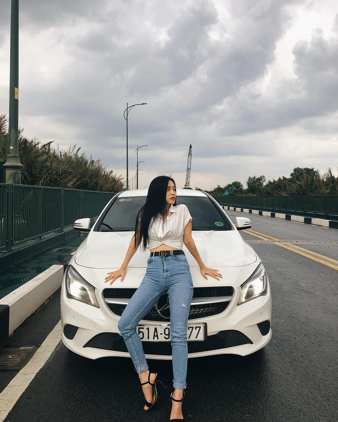 Sĩ Thanh trông trẻ trung, quyến rũ hết mức với cách mix áo sơ-mi sọc cùng quần jeans wax sáng.