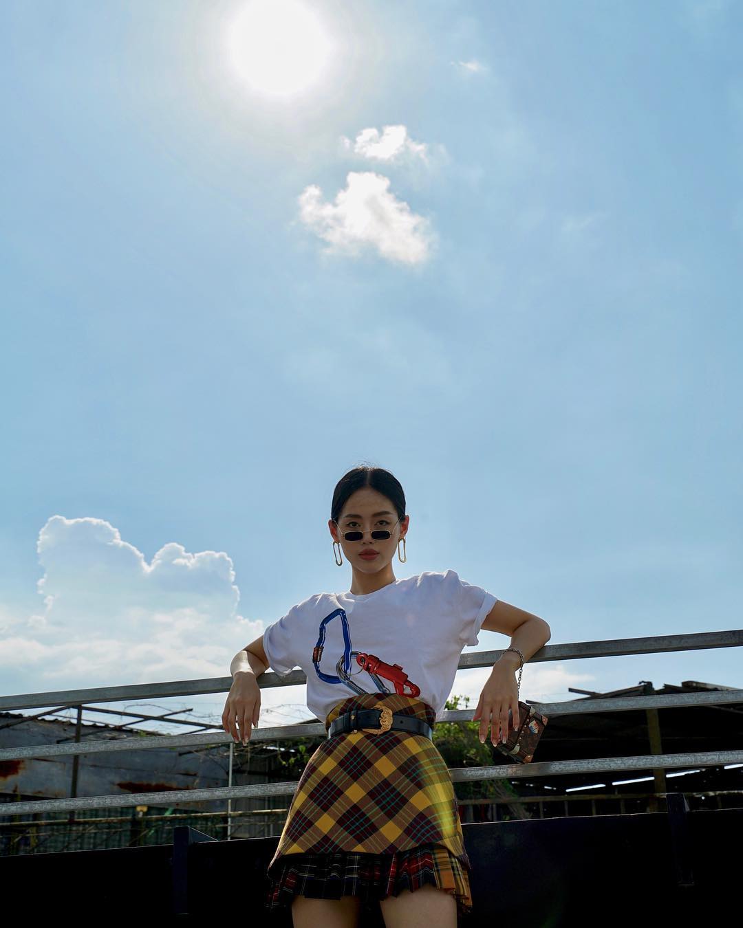Áo phông họa tiết cùng chân váy ca rô gam màu sáng khi được mix cùng loạt phụ kiện thích hợp đã đem lại sự nổi bật cho Khánh Linh the Face.