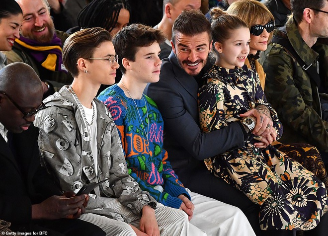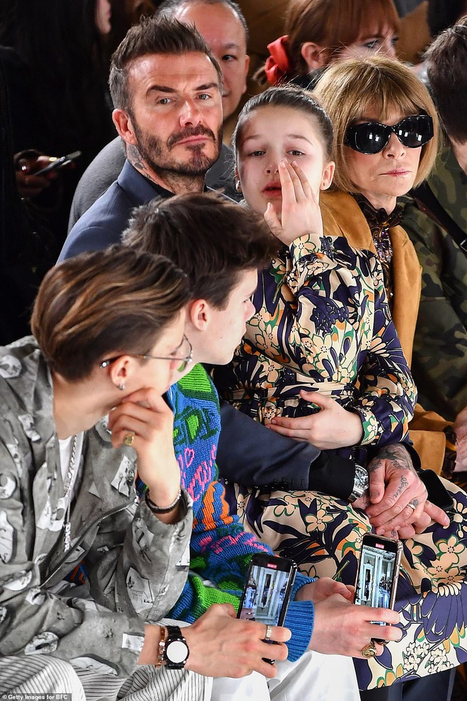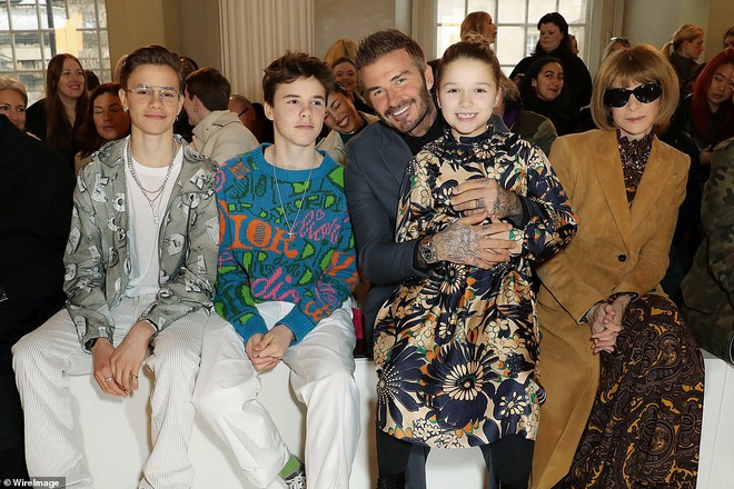 Năm nay, các tín đồ cũng phát hiện thiếu vắng hình bóng của cậu con trai cả Brooklyn Beckham đến xem show thời trang của người mẹ nổi tiếng của mình, ngồi cạnh gia đình là Tổng biên tập tạp chí Vouge - Anna Wintour