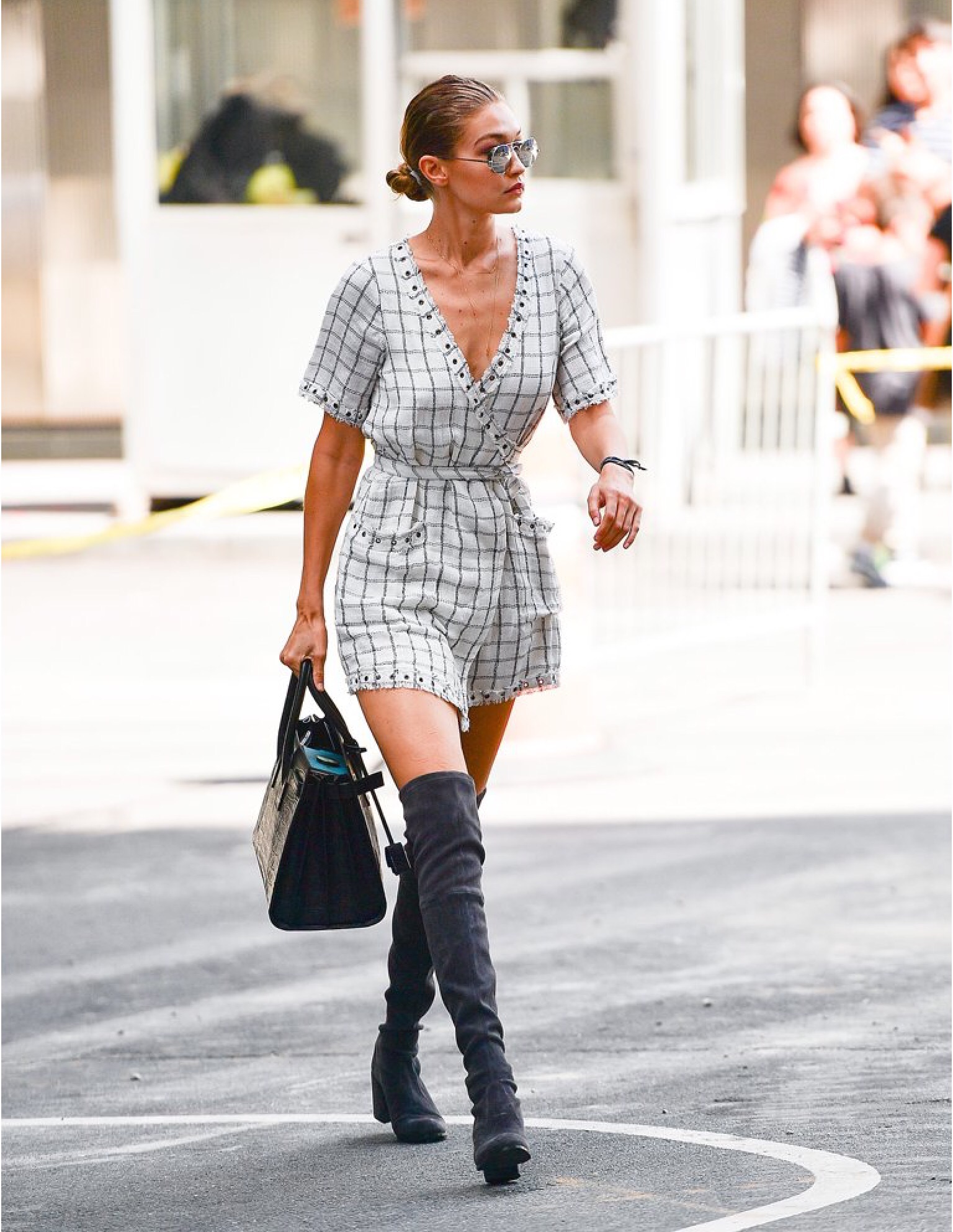 Bên cạnh là một người mẫu, Gigi Hadid còn được biết đến như một biểu tượng thời trang với lượng theo dõi lên tới hơn 30 triệu trên mạng Instagram. Giống như nhiều thiên thần Victoria Secret’s như Kendall Jenner, Alessandra Ambrosio, Gigi rất yêu thích kính Linda Farrow gương phủ bạch kim. Phối váy kẻ với bốt cao cổ bên cạnh túi xách khổ lớn, Gigi Hadid vẫn rất nổi bật và cá tính khi kết hợp cùng kính này.