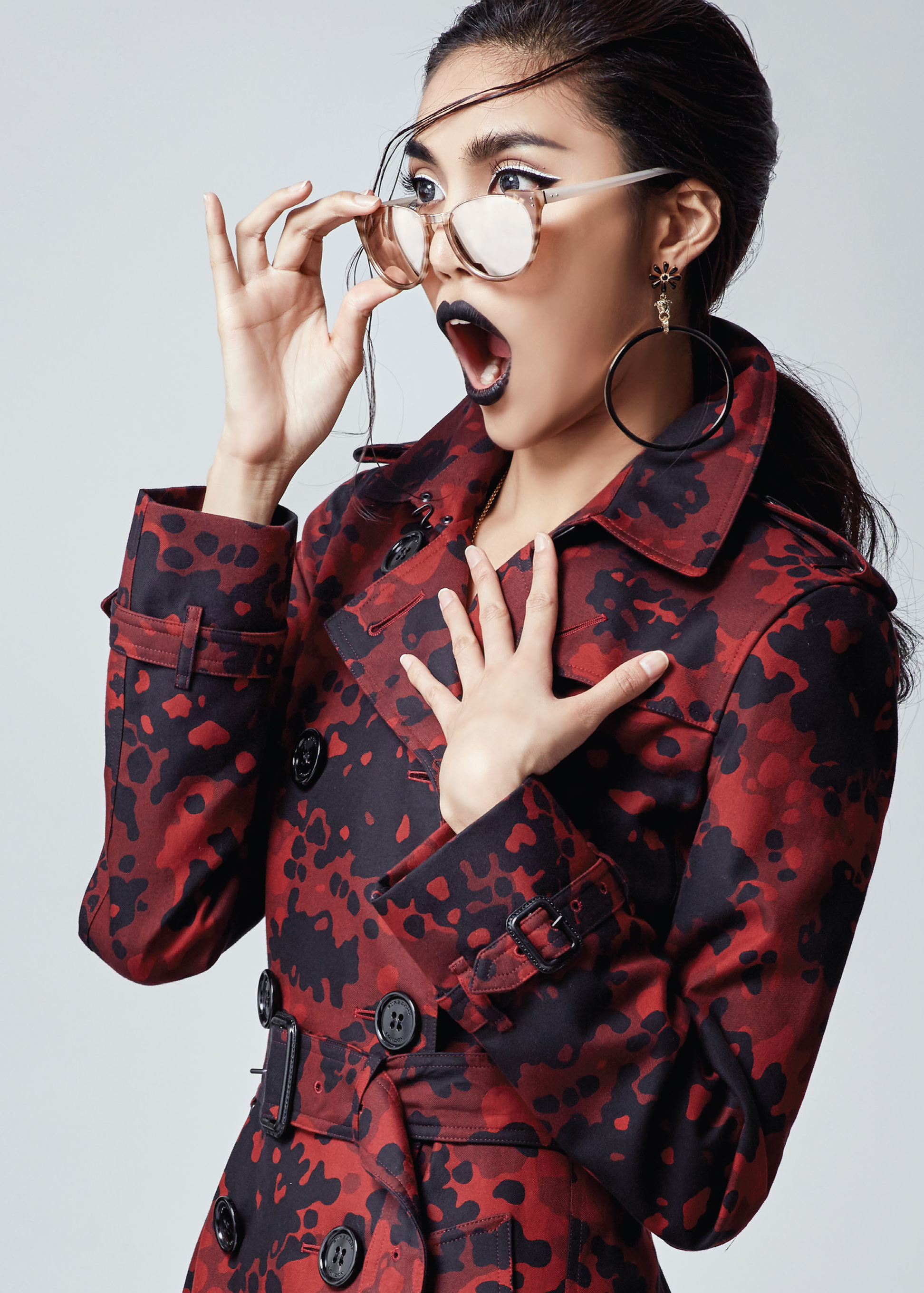 Kính Linda Farrow gương phủ vàng kết hợp với áo khoác họa tiết lạ mắt đã đem lại một hình ảnh cá tính nhưng không kém phần sang trọng cho hoa hậu Lan Khuê.