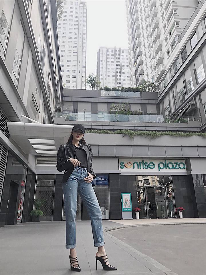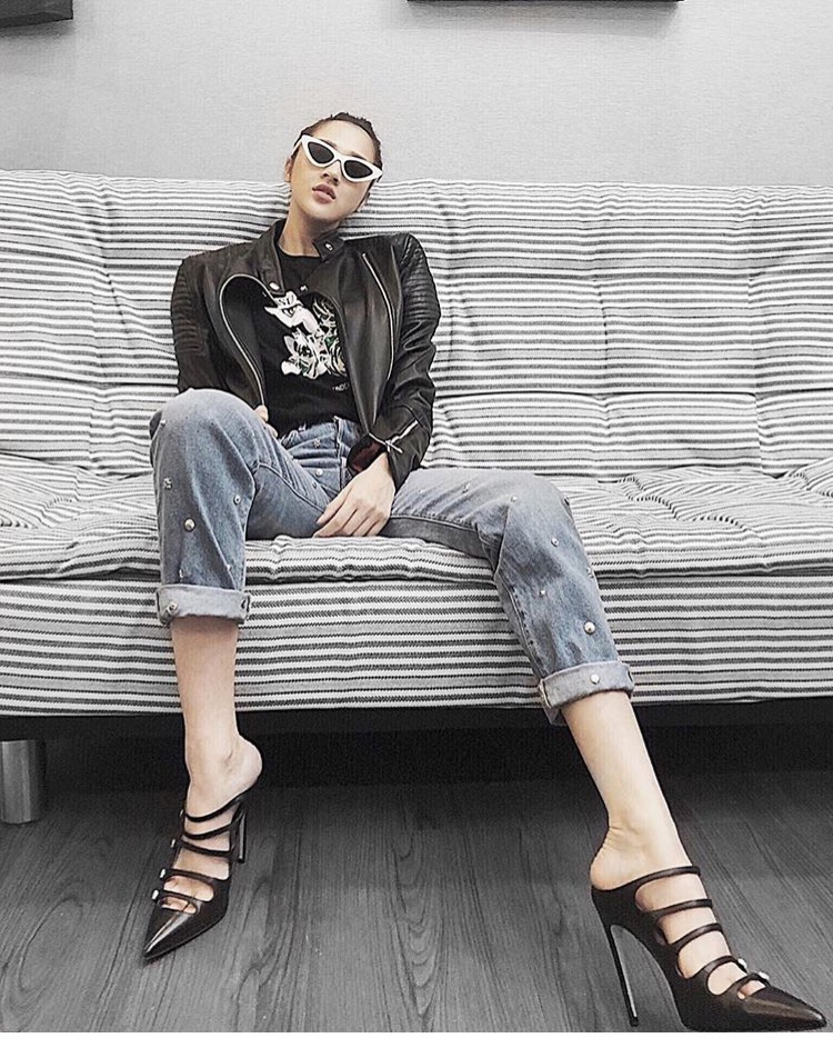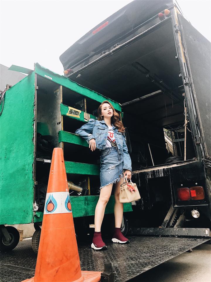 Ngày càng thích thú với style khỏe khoắn, năng động, gần đây Minh Hằng liên tiếp khoe những outfit chất lừ. Cô nàng diện denim on denim với áo khoác và chân váy rách gầu cực ngầu. Điểm nhấn nổi bật của outfit là đôi Balenciaga màu vang chát.