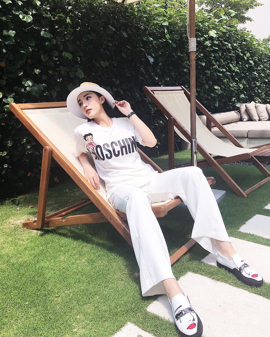 Có vẻ như màu trắng là dress code trong chuyến du lịch kỳ này của các nàng. Nếu Kỳ Duyên vẫn vô cùng sanh chảnh cùng cả cây đồ đắt giá của Moschino.