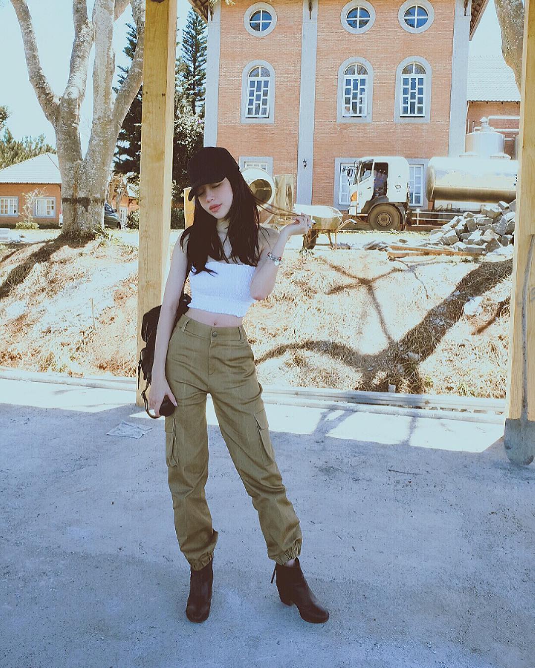 “Mẹ hai con” Elly Trần khoe eo thon cùng croptop và quần túi hộp. Cô nàng cũng tăng thêm độ thời thượng bằng mũ lưỡi trai và chiếc ba lô đeo sau lưng.