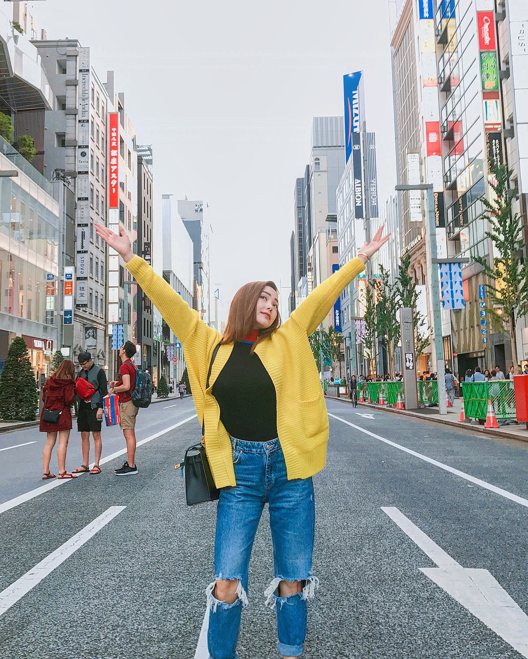 Minh Hằng lại đem đến chút màu sắc cùng chiếc áo dáng dài tông vàng mustard trên đường phố Nhật Bản.