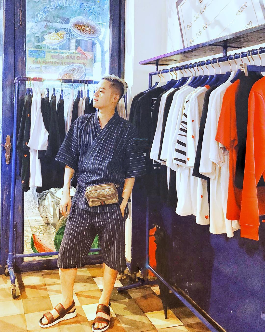 Thanh Duy trông lạ mắt khi mix chiếc fanny pack đắt giá của Gucci chung với cả cây kimono của Nhật.