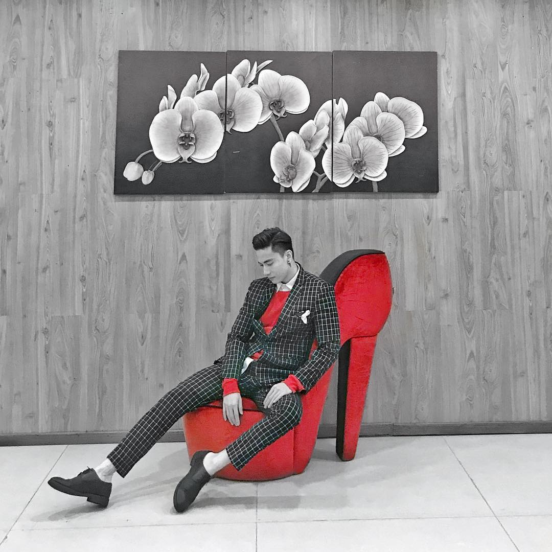 ST cool ngầu khi diện cả cây vest mix layer cùng sơ-mi và áo thun đỏ phía trong.