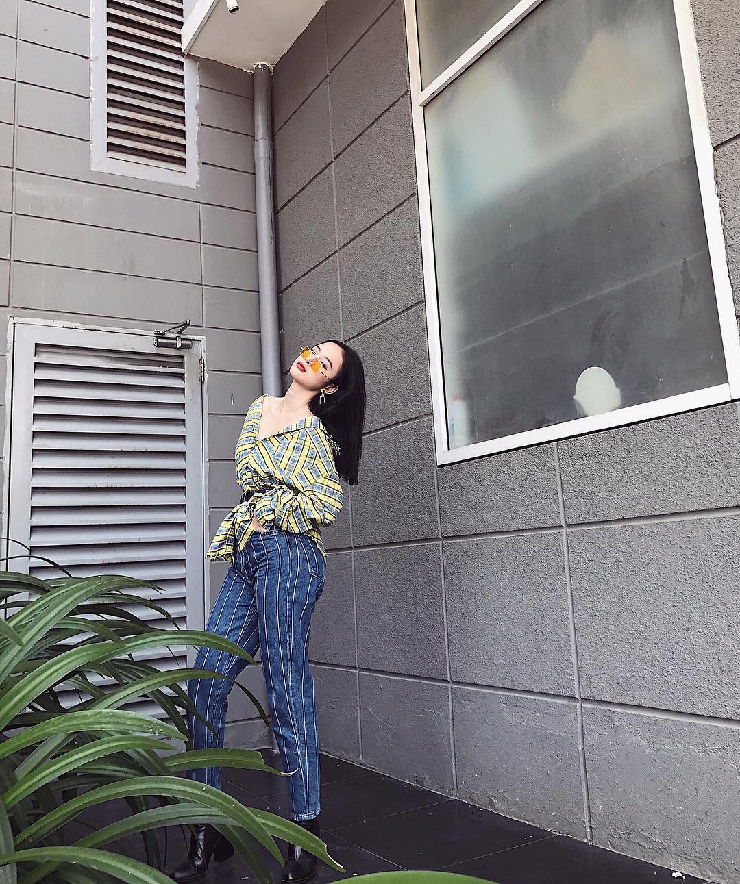 Bộ cánh cả cây sọc, ca-rô bản to từ áo đến quần đã được Angela Phương Trinh phối cách tinh tế, không hề rối rắm, rườm rà. Bí quyết của cô nàng là sử dụng những họa tiết có hình dáng, kích thước gần giống nhau, cũng như việc lựa chọn hai tông màu xanh, vàng tương phản, tạo tỉ lệ cơ thể. Ngoài ra, cách đeo kính mát cùng màu áo cũng là một điểm cộng đáng kể cho set đồ này.