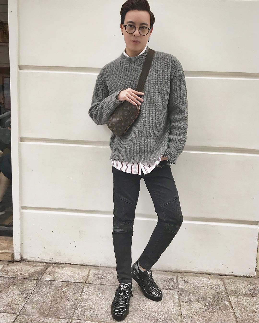 Gam màu trung tính cũng được stylist Huy Mạch lựa chọn khi xuống phố tuần qua. Anh chàng phối áo sơ mi layer cùng áo dệt thoi màu xám. Điểm nhấn set đồ nằm ở chiếc túi Louis Vutton và đôi giày đen da bóng thời thượng.