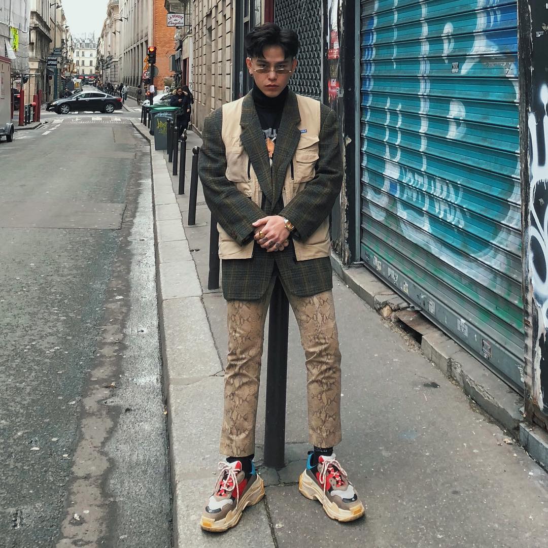 Cả cây nâu chuyển tông từ áo đến quần là lựa chọn của Decao khi du hí tại Paris. Điểm sáng nổi bật đắt giá của set đồ này nằm ở đôi Balenciaga Triple S màu sắc mà anh chàng đang mang, cùng phụ kiện kính mát tròng tí hon xu hướng.