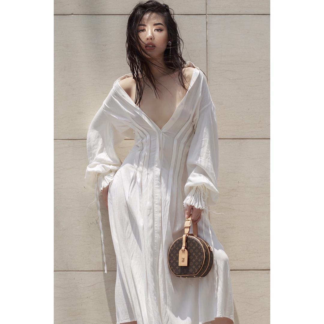 Để kiểu tóc ướt sũng từng khiến Bảo Anh nhận bao lời chê trách, mà Khánh Linh The Face lại gợi cảm lạ lùng. Cô nàng mặc đầm suông trễ nải cùng sử dụng túi Louis Vuitton càng làm tăng thêm độ sexy, sang chảnh.