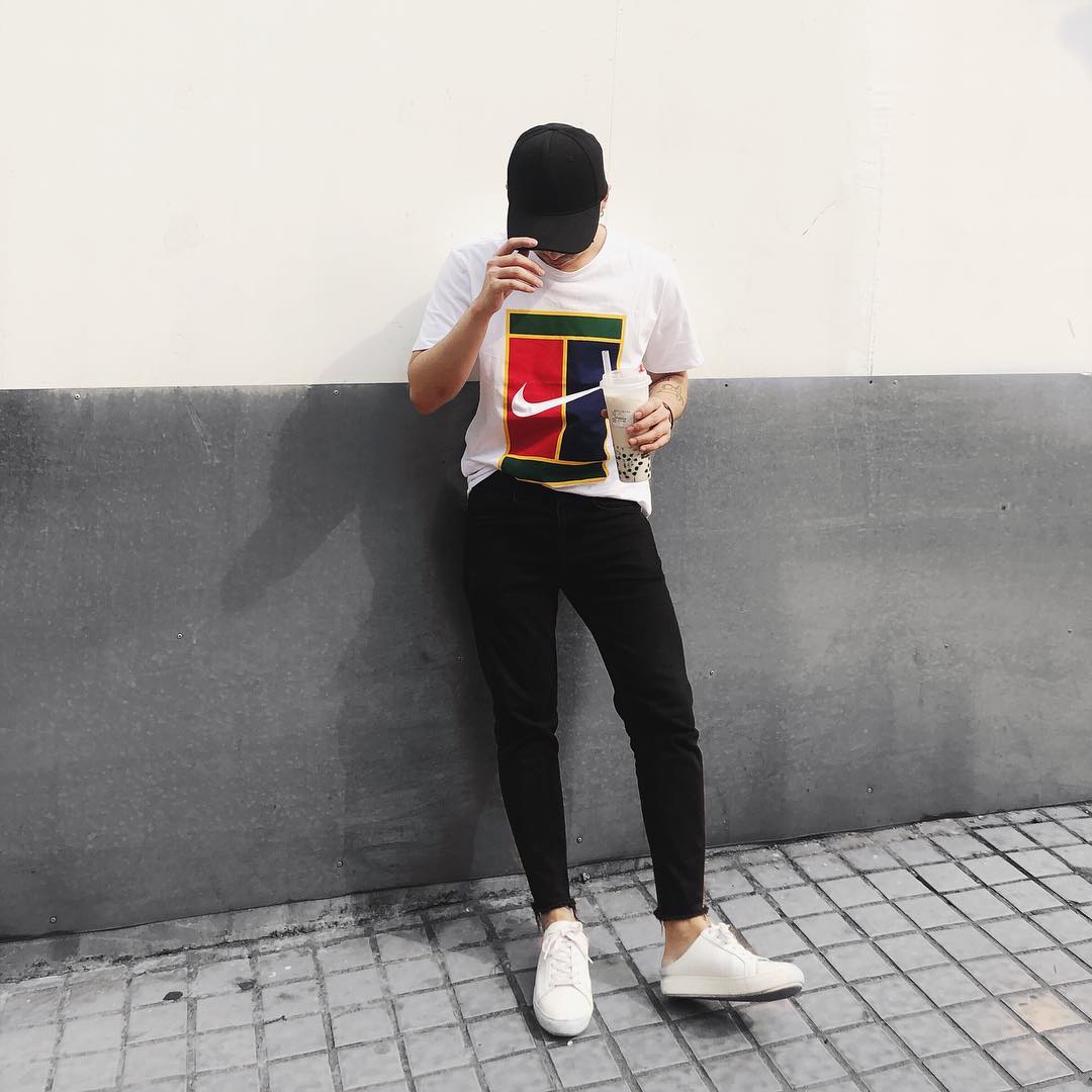 Không cần cầu kỳ, áo thun với hình in nổi bật mix cùng kaki ôm, thêm giày và nón thể thao là đã đủ để khiến Hoàng Ku “tỏa sáng” khi xuống phố.