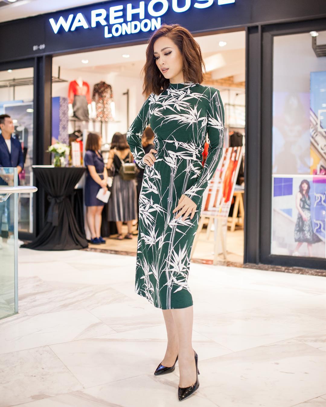 Chiếc váy xanh ôm sát tuy giúp Ái Phương khoe trọn vóc dáng hình thể nhưng kiểu áo dài tay, độ dài đầm qua gối khi đi cùng mái tóc xoăn lại khiến nữ ca sĩ bị cộng thêm vài tuổi.