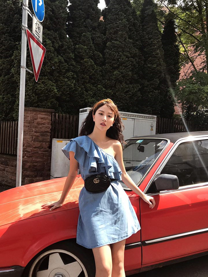 Minh Hằng cũng được biết đến là tay chơi hàng hiệu “không vừa”, bởi vậy chiếc túi đeo hông thời thượng này cũng không lọt ngoài tầm tay cô. Minh Hằng dường như đã vô tình “nhấn chìm” món phụ kiện hàng hiệu này khi phối áo có cùng tông đen với túi, kết hợp chân váy ngắn kém sang. Mái tóc xõa tự nhiên che bớt một phần khuôn mặt khiến nhan sắc cô lu mờ hơn hẳn ngày thường.