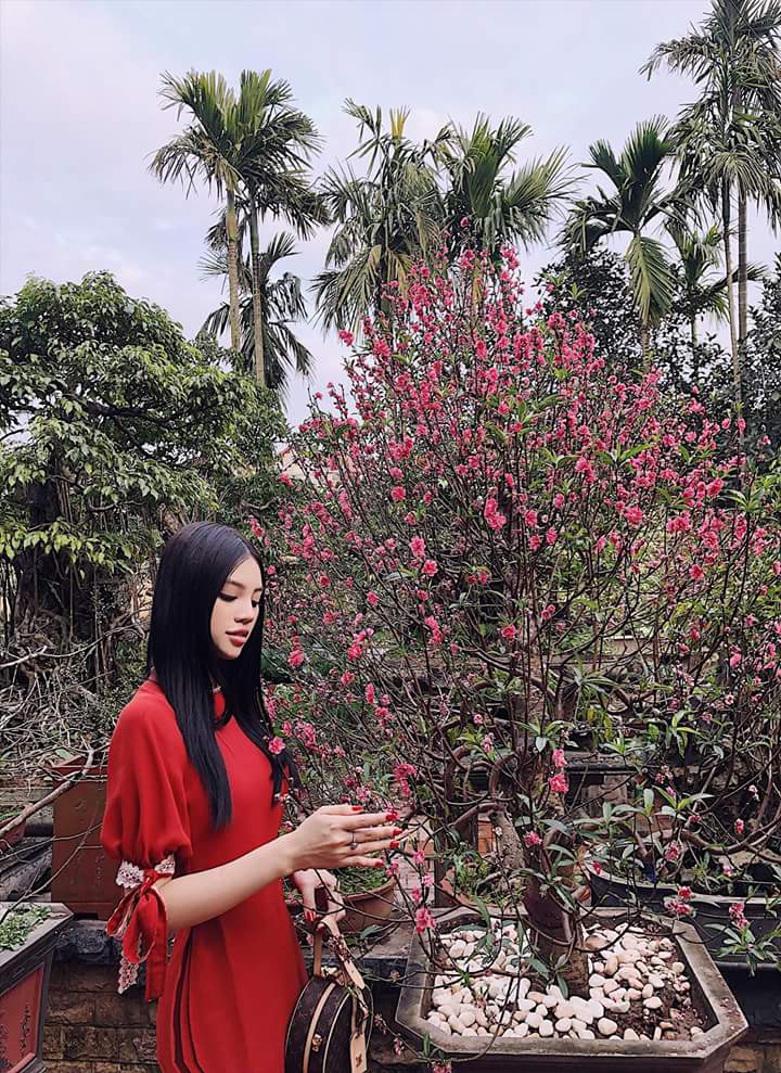 Đi chúc Tết ngày mùng 1, Jolie Nguyễn lựa chọn tà áo dài đỏ với phần tay bồng có nơ xinh xắn. Cô nàng cũng phối cùng túi tròn của Louis Vutton, khiến set đồ nâng tầm thời thượng.