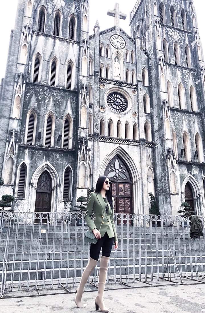 Tông màu xanh lại là lựa chọn của Jolie Nguyễn ở ngày tiếp theo. Diện áo vest bốn nút, vai độn khá đứng đắn, người đẹp khiến vẻ ngoài của mình không bị già đi khi phối cùng boots cao quá gối cùng tông màu.