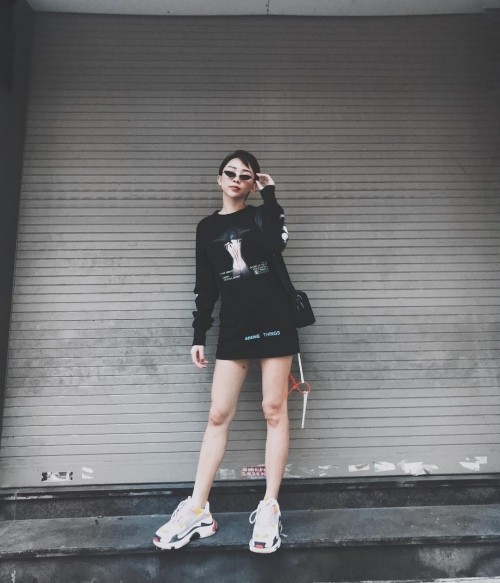 Sang đến mùng 3, cô nàng dành sự ưu ái cho gam màu đen cá tính với áo dáng dài cùng kính mát tròng tí hon. Điểm nhấn của outfit nằm ở đôi giày Balenciaga ấn tượng.