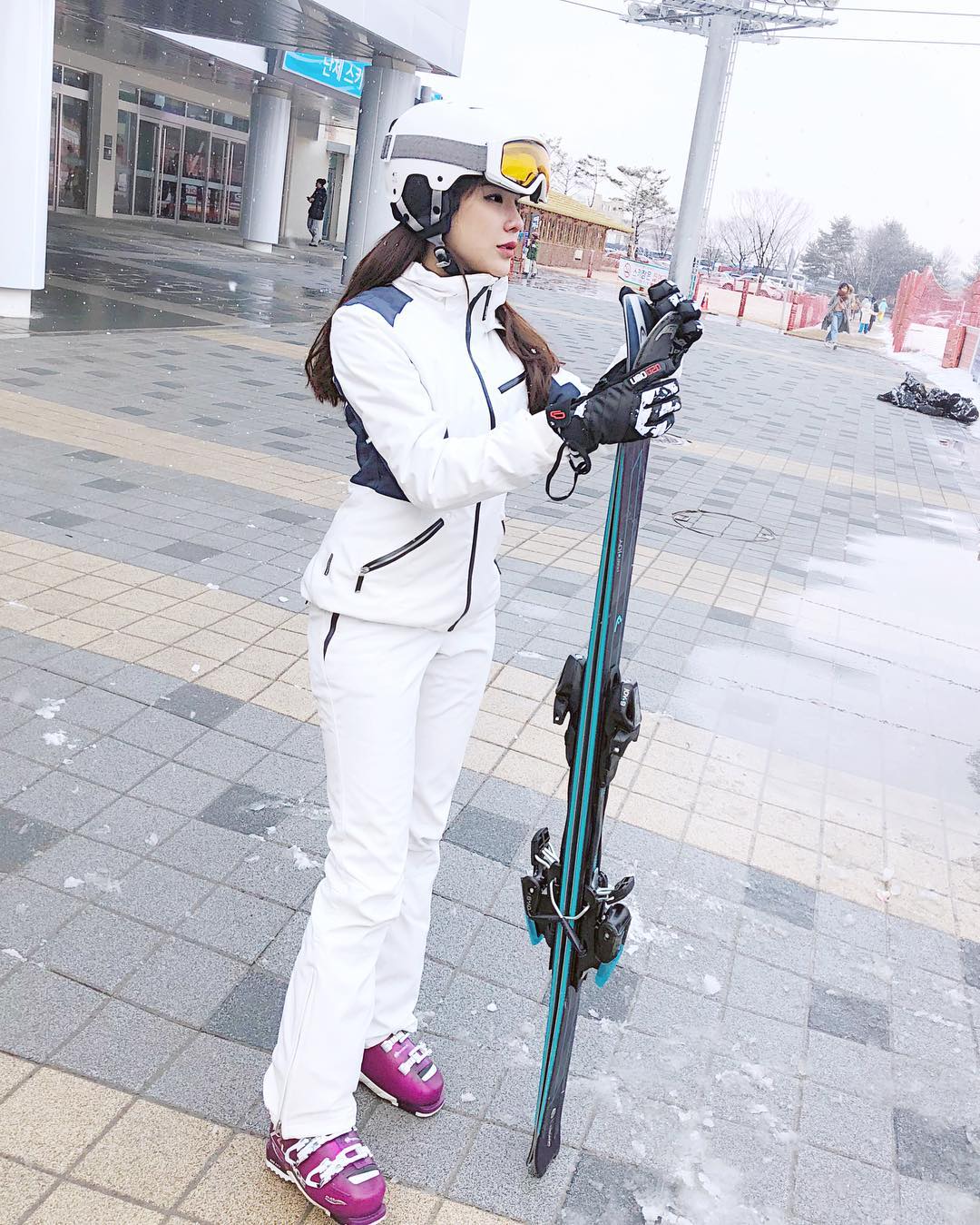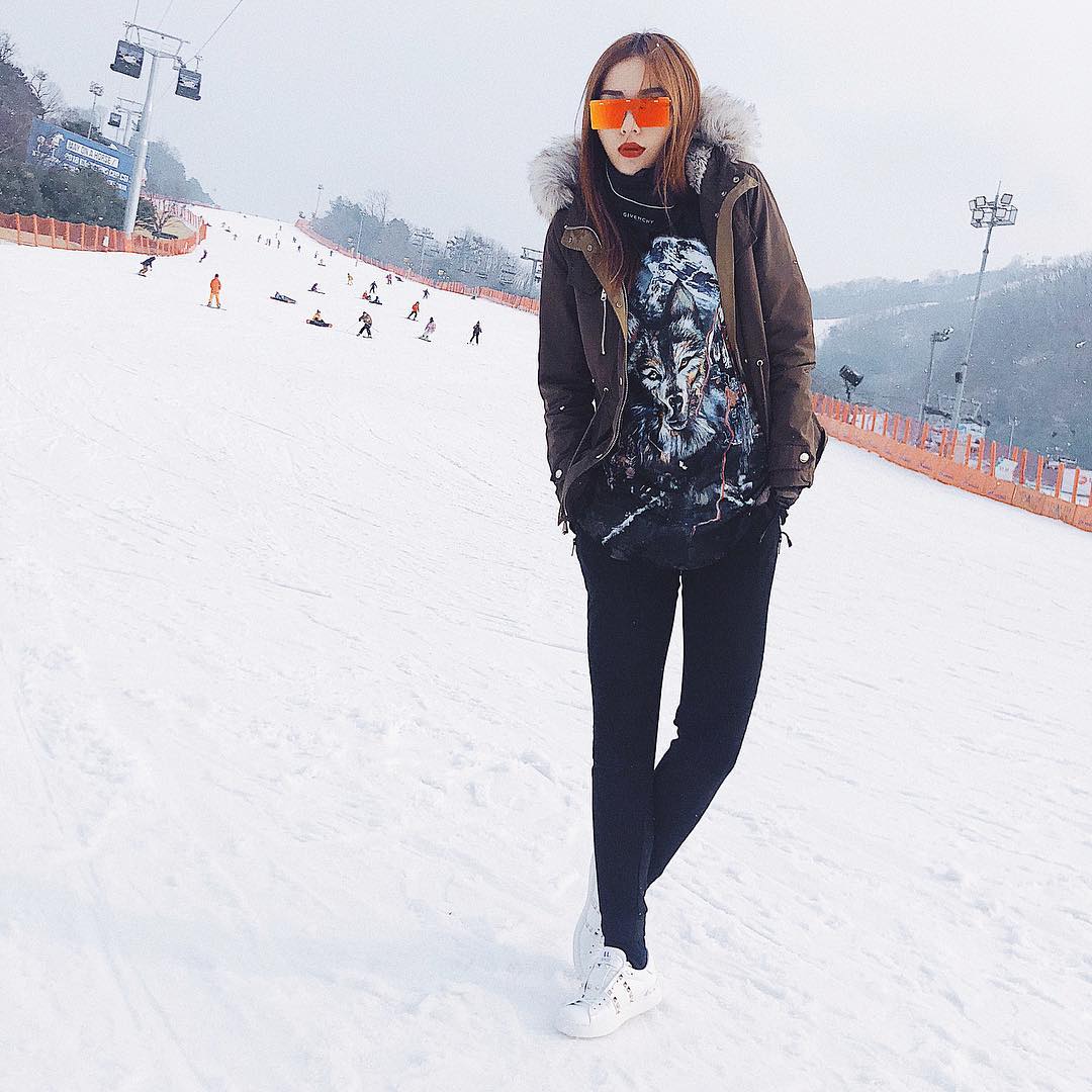 Diện trang phục trượt tuyết nhưng Diệp Lâm Anh vẫn vô cùng thời thượng. Với cách lựa chọn cả cây trắng thanh lịch, đôi giày tím hồng làm điểm nhấn, cô nàng là minh chứng cho việc mặc đồ tập, đồ thể thao vẫn có thể đẹp như thường.