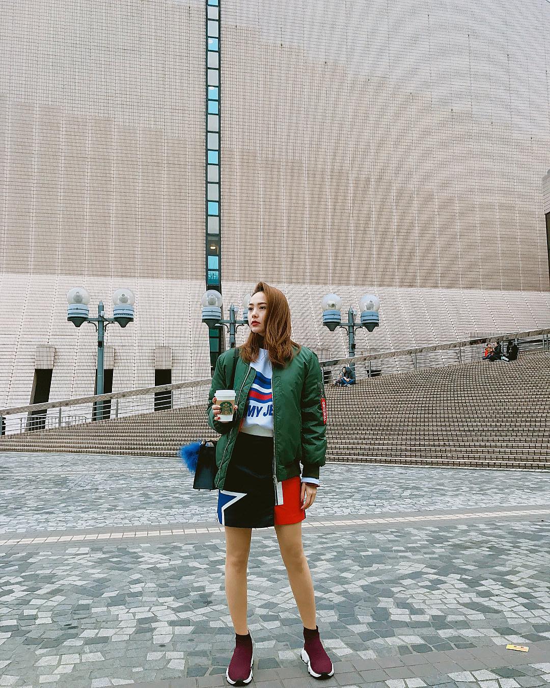 Minh Hằng vô cùng trẻ trung với set đồ màu sắc. Cách lựa chọn đồng điệu từ áo khoác đến giày đem đến sự cân bằng trong outfit nhiều màu này.