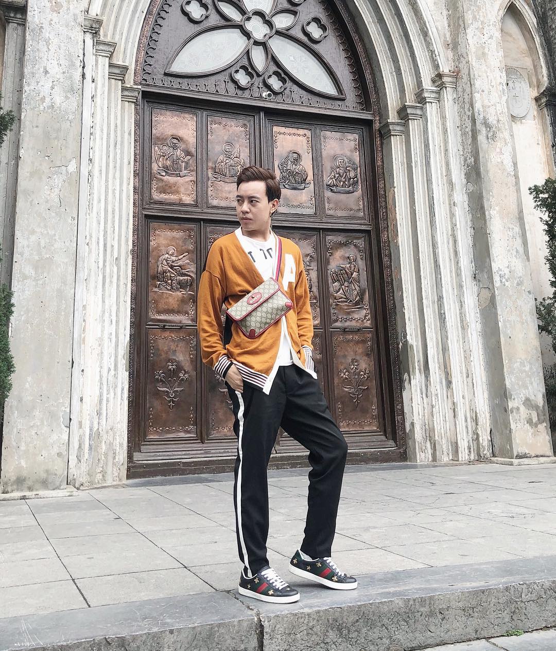 Stylist Huy Mạch đem đến outfit tươi trẻ nhưng vẫn có nét lịch lãm với áo cardigan vàng đất cùng quần skinny đen. Đặc biệt, không thể bỏ qua đôi sneaker cùng túi đeo chéo thuộc thương hiệu Gucci mà anh chàng đang sử dụng, chỉ hai món phụ kiện basic nhưng đã nâng tầm set đồ lên rất nhiều.