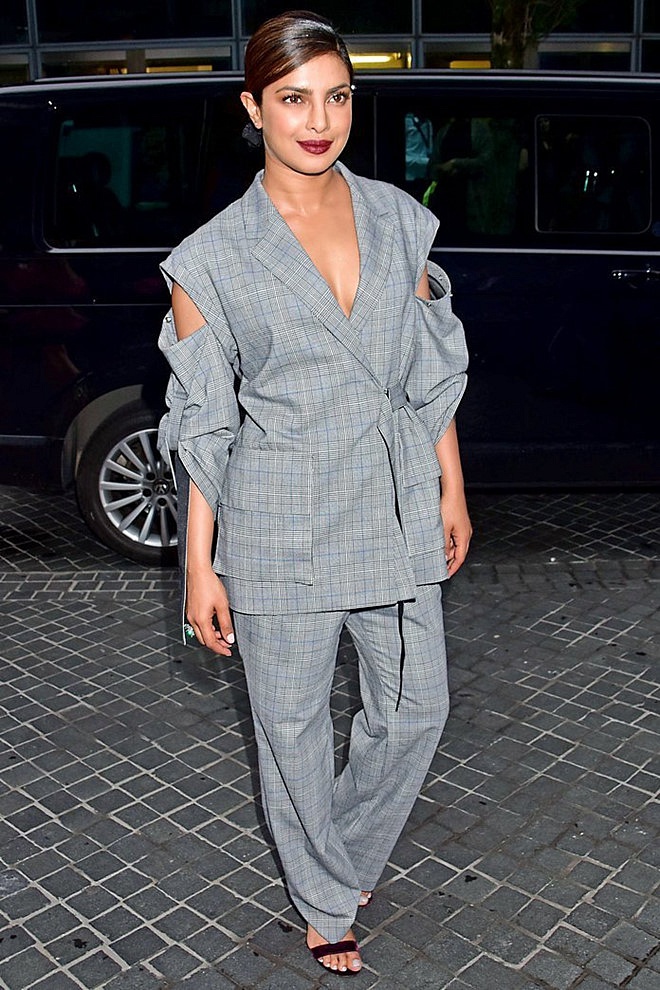 Priyanka Chopra cũng là fan của cả cây vest xám, nhưng cách cô biến tấu với thiết kế hở vai và rút nhún khiến cho bộ trang phục mất đi vẻ nam tính vốn có mà vẫn trẻ trung, năng động.