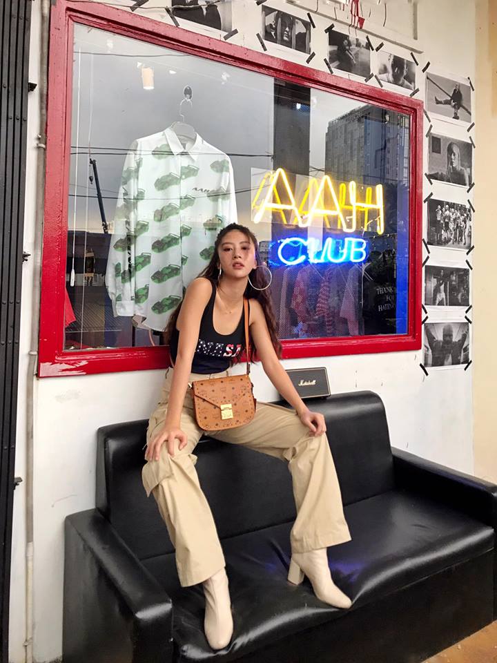 Mặc quần khaki túi hộp khá bụi, Quỳnh Anh Shyn diện cùng tank top đơn giản nhưng không kém phần nổi bật.