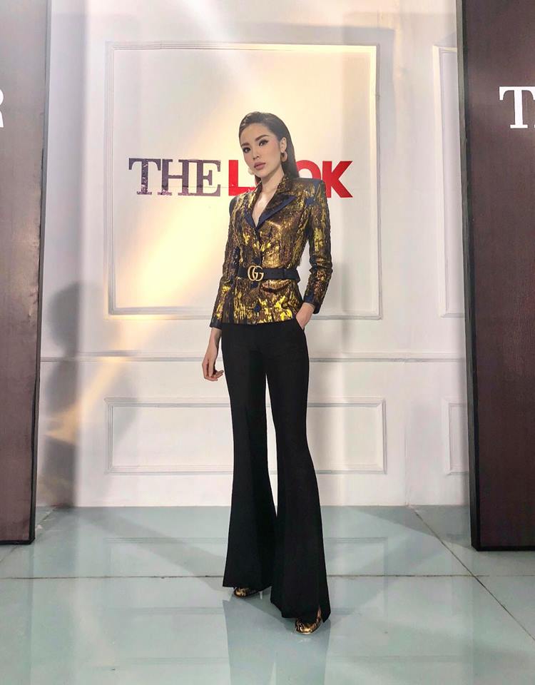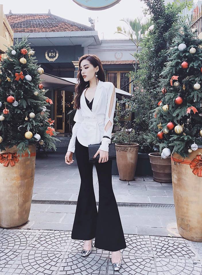 Không như các người đẹp khác, Kỳ Duyên chỉ chọn mặc quần ống loe bằng vải mềm mại. Vậy mà cô nàng vẫn có thể đẹp mọi góc độ chỉ với kiểu quần vải này.