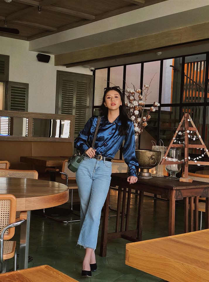Chiếc quần này quả là chìa khóa vạn năng giúp cô nàng làm điệu. Kết hợp với áo sơ mi lụa đơn giản, Quỳnh Anh Shyn đã có vẻ ngoài vintage dịu dàng.
