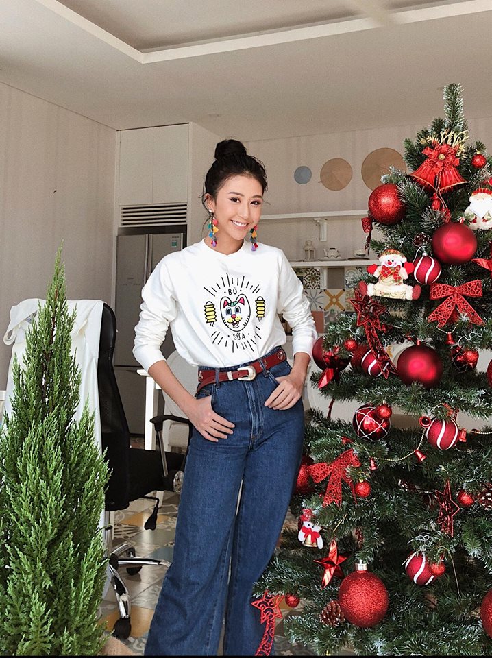 Những chiếc quần ống loe bằng vải jeans của Quỳnh Anh Shyn vẫn chiếm ưu thế. Trong ngày Noel, cô nàng diện quần jeans ống loe kèm chiếc áo thun trắng có họa tiết vui nhộn.