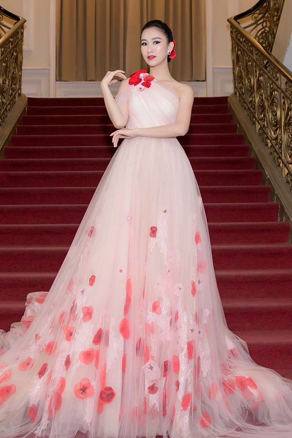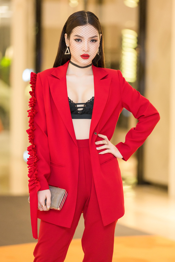 Á hậu Tú Anh tuần qua cũng đã tạm chào gam màu đen mà chuyển sang diện đầm tông đỏ đậm làm nổi bật làn da trắng sứ. Vẫn là phong cách trang điểm trong suốt, Tú Anh không bao giờ trang điểm quá đậm bởi bản thân cô đã có vẻ đẹp ngọt ngào rất ưa nhìn.