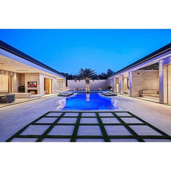 Vườn nhà của Kylie Jenner với hồ bơi to thông thoáng tạo cảm giác thoải mái khi ngồi trong phòng khách mà như ngồi ngoài trời