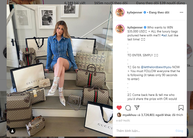 Mới đây, người hâm mộ bất ngờ khi Kylie Jenner update trên trang instagram cá nhân khi nữ tỷ phú ngồi thả dáng với loạt túi hiệu Gucci đắt đỏ cùng phần tiền mặt trị giá 35.000 USD với dòng status nếu làm đủ các yêu cầu được đặt ra fans sẽ được món quà sang chảnh như trong hình.