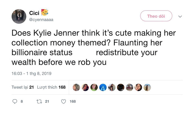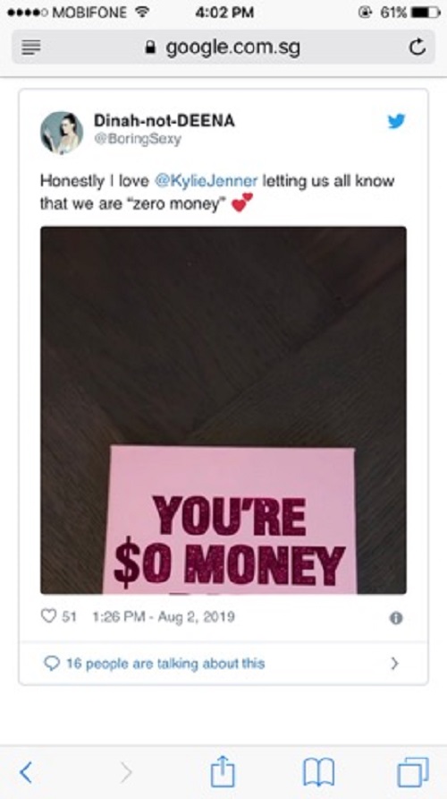 “Thú thật là tôi thích cảm giác Kylie Jenner cho tất cả mọi người biết rằng chúng ta là những người không có tiền thông qua bìa sản phẩm với dòng chữ ” You are $0 money”.