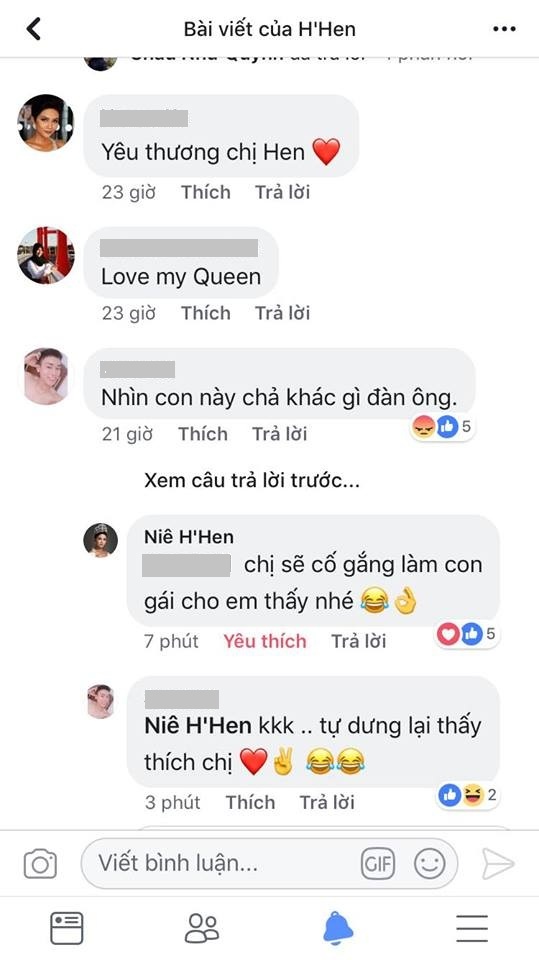 Bình luận này đã gặp phải rất nhiều sự phản đối cũng như gây bức xúc cho nhiều fan của H'Hen Niê. Trước lời bình luận không mấy tốt đẹp về mình, người đẹp Ê-đê khéo léo trả lời lại: “Chị sẽ cố gắng làm con gái cho em thấy nhé”.