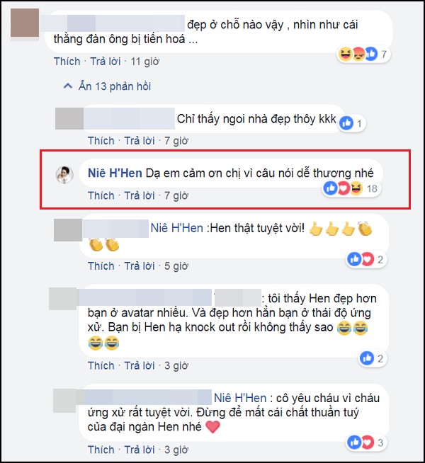 Đứng trước câu trả lời thân thiện đúng chuẩn “Hoa hậu” của H'Hen Niê. Ngay lập tức tài khoản facebook này đã xoay ngược tình thế 360 độ. Từ chỗ chê bai, miệt thị bỗng chốc “Tự dưng lại thấy thích chị”.