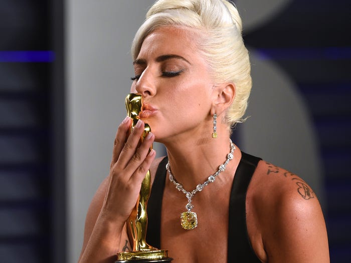 Nhớ lại lễ trao giải Oscar 2019, Lady Gaga thanh lịch tuyệt đối trong chiếc váy quây kèm găng tay màu đen của hãng Alexander McQueen. Cô chọn chuỗi vòng cổ kim cương vàng 128 cara để hoàn thiện cây thời trang. Lần gần nhất chiếc vòng này được đeo công khai là vào năm 1961 khi Audrey Hepburn tham dự họp báo phim ‘Breakfast at Tiffany’s’.